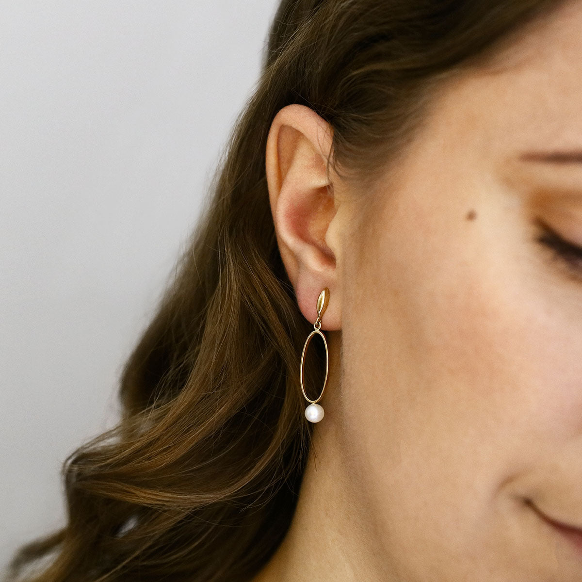 Modern elegance meets timeless sophistication in these contemporary open oval link drop earrings. Crafted in 9K yellow gold, the design features a graceful curved open oval framework from which a 5mm lustrous pearl drop gently suspends, catching the light perfectly.