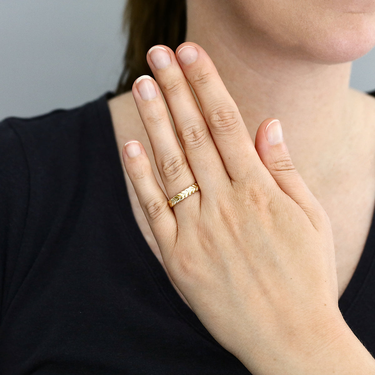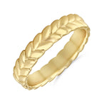Inspired by nature’s delicate beauty, this 4mm ring in 9K yellow gold features an intricate pinnate leaf design that flows gracefully around the entire band. Each finely detailed leaf is sculpted to create a continuous pattern, offering a subtle sense of movement and organic charm. The warm glow of yellow gold enhances the natural motif, making this ring a perfect symbol of growth, connection, and timeless elegance. Ideal as a meaningful gift or a distinctive addition to your everyday jewellery.