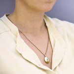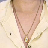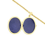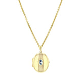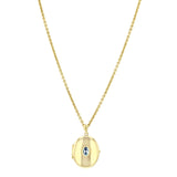 The oval locket pendant measures 12.9mm x 7.7mm, extending to 29mm including the bail, and is adorned with a 5.7mm x 3.9mm faceted topaz, bezel-set for a clean, contemporary finish. Suspended from a 2mm-wide, 22" gold chain, the locket sits beautifully at the collarbone or just below, perfect for everyday wear or layering.